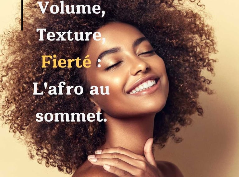 "Des boucles rebelles, une beauté singulière." : Ce slogan joue sur le contraste entre le caractère indomptable des cheveux afro et leur beauté unique. Il valorise la diversité et l'originalité de chaque type de cheveux afro.